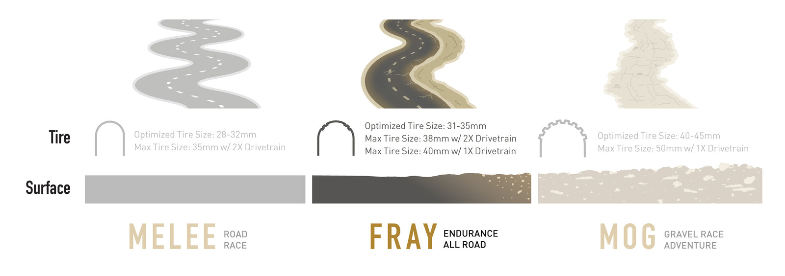 Capable of accommodating tires between 36mm and 40mm for when mixed-surface missions call. The Fray's geometry is optimized for tires between 31mm and 35mm.